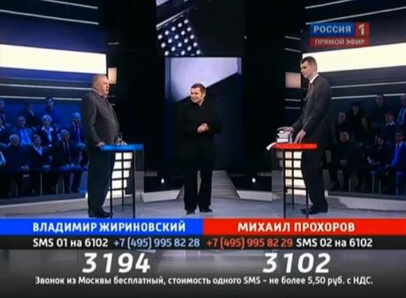 Прохоров разнес Жирика под ноль. Жирик в плохой форме, сдулся. Анпилов оказался хам и подлец, и еще один секундант Жириновского — тоже полная сволочь. Но дело они делали, тридцать минут Прохорова го**** поливали, а Прохоров молчал, терпел... Прохоров больше слушает, и ему есть что сказать. И на этом фоне Жириновский легковесен, но он фактически занял пропрохоровскую позицию, фактически агитирует за Прохорова