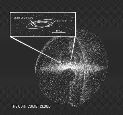 Москва в кружечке это солнечная система, а синий кружок это облако оорта или Могучий Тор. Кометы это система слежения. Пояс Койпера это дополнительный заградительный щит Тора. По скандинавской легенде Тор отправлялся к ледяным великанам в Йотунхейм. Конечно, это возможно, но я думаю, не имеет смысла, так как температура в облаке орта близка к абсолютному нулю.