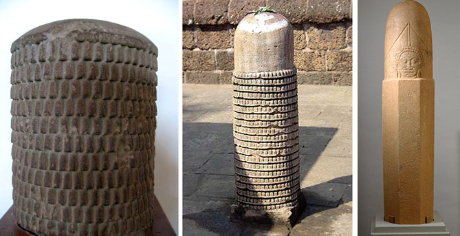 Лингам в переводе с санскрита – отметка, знак. Самые древние индусские образцы мало чем отличаются от египетских, греческих или малоазиатских: моделировались резьбой структурно похожей на чешуйки «шишки», служили как геосимволика и объяснялись проявленным здесь образом Вечного Непроявленного Пара-Шивы. Но с течением времени и благодаря богатейшей фантазии индусов форма их становилась всё более вытянутой, и в итоге на верхушке лингама появилась.. гм.. головка мужского члена, первоначально намеком, угадываясь – а затем с натуралистическим откровением. Мол, нате-с.