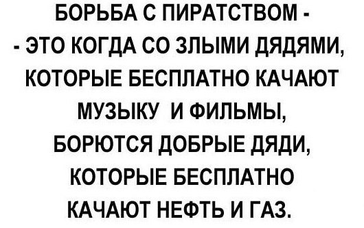 В связи с этим пиратство, которое позволяет свободно распространять информацию, фильмы, книги, музыку, и прочее позволяет избежать многих негативных последствий. Немалую роль в борьбе мира за свободу играет сейчас Россия, в которой свободное распространение приобрело большие масштабы. Но мировая мафия стремящаяся всё поставить под свой контроль, не оставив людям выбора не в чём, даже в том, что смотреть и что читать, снова пытается диктаторскими и цензурными методами повлиять на эту ситуация введя очередные меры контроля за сферой распространения информации в интернете.