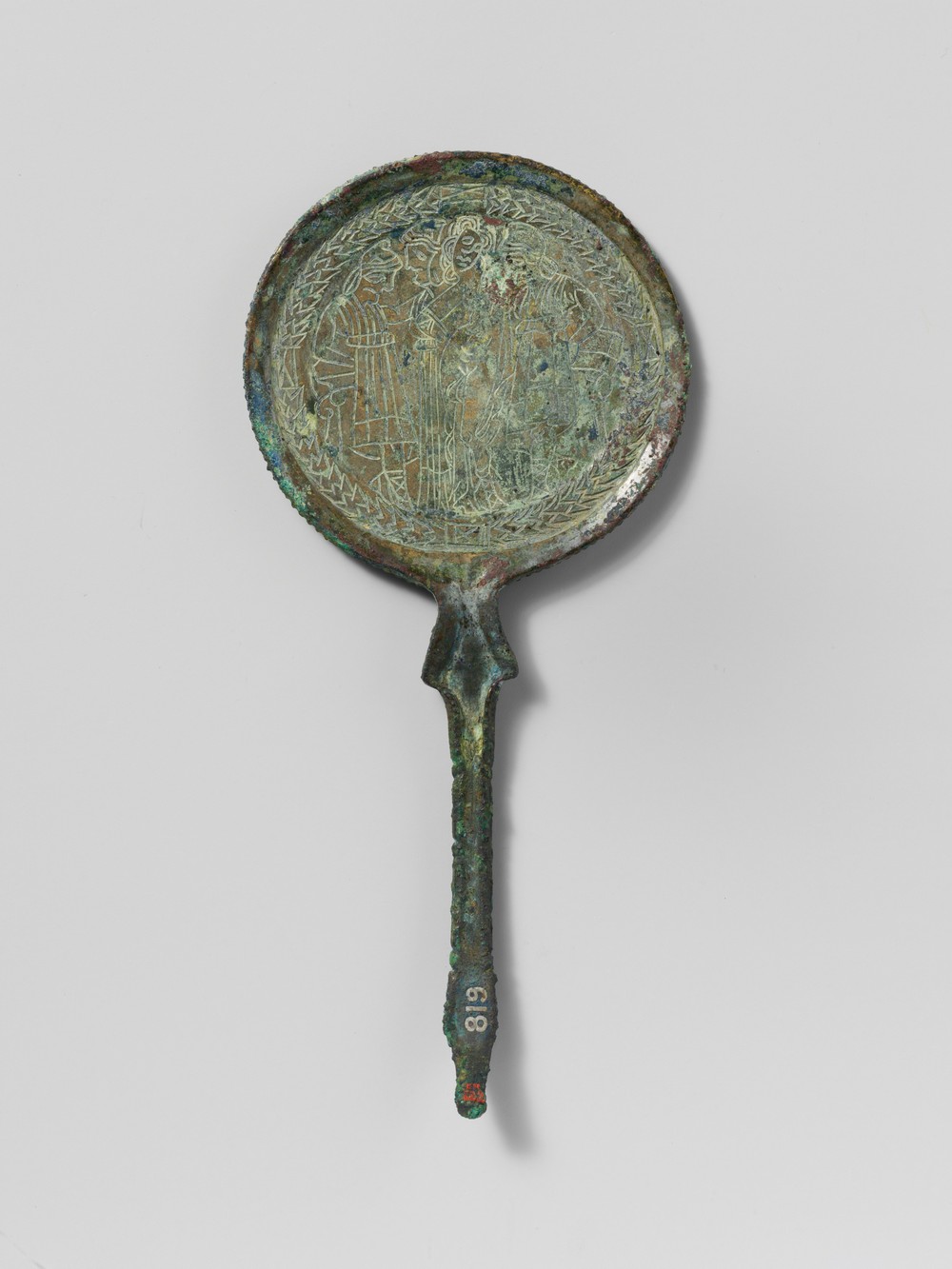 Вот, к примеру, зеркало с цифрой "820" на рукоятке (более старшей – по Чудинову – датировкой, которую мы пока предположительно считаем номером по каталогу Гизелы Рихтер):